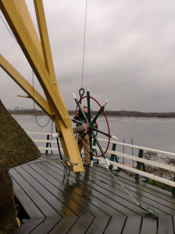 A volunteer miller applies the brakes to the windmill. (Actually the job of a miller is not devoid of danger. A popular saying in Dutch is ‘Een klap van de molen hebben’, literally ‘to have been hit by the windmill’. It means being strange, eccentric or just plain crazy. We checked, the millers seemed normal enough.)