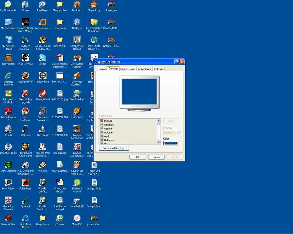 Meh… Every time I look at discussions by categories, this one keeps popping up this isn’t my desktop (but pretty close). I don’t have a picture storage space online so this’ll have to do. Your basic boring Windows XP with the plain blue background (with only a few less icons than shown here). I just felt it should be represented too (and as long as this thread keeps staying so near the top, and in the spirit of 'if you can’t beat 'em join em) why not?
