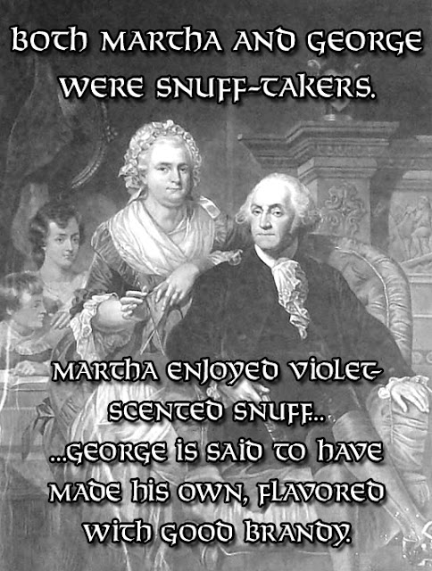 Quick note about the Martha and George thing - I just found a list of goods ordered for George Washington, and it includes 3 lbs. of Violette Strasberg snuff and 3lbs. of Scotch Snuff. All the quantities on the list of goods were large, but that’s a lot of snuff! Must have been a large staff and lots of guests at their home to go through that much snuff!