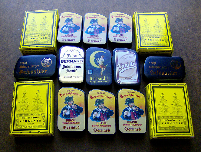Ones I have waited a moment,they come from USA by Mr Snuff, not ,visibly, in exact adequation With English package.Insted or a bit in reason of having to wait I was happy to recieve my 3 Maccoboys,fine tobacco and disctet but well here roses exhalations,It’s on cultural exeption on U.S snuffs all made by (good)whisky. In some days I should recieve 3 tins differents of the new Stock’s range. I like recieving my “loving plant for hight nose” on several times,QTake things by the good way , it’s one of the mean to not be anxious(in live sometimes here but for most time injustified),I speak of course for things of life not on direction for uniquity(another subject But what I’m waiting for, quitly, are samples of one snuff make by fine head,nose an very nice director of a Snuff mark,of my demand of new product( a bit my personal snuff after for the maker , in right positions. I will perhaps make explanation more late(if anyone is interested by a nice new product, more anycase of his nearest personal parasite(same for overwhelming majority: jealousy(for all,for nothing…Thinking in false vision that illusioned inferiority supposed can put one in superiority if , this bad,real, “sin” put them in personal mental jails:) I hope it will be very good,as that I would said to my litlle childrens i’m around the first steps of this first class snuff,I hope… -)