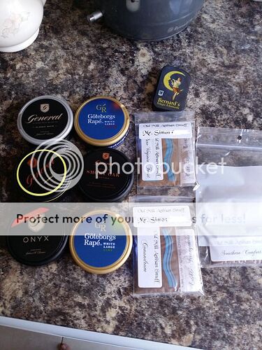 Just got an MS order today, containing among other things: 6 photo Kailash 6 gm. sample Arnold Andre’s Rumney’s Export 7 gram S.A. Rumney clone - 2 five gram earplug plastic boxes WoS A Posh brass bullet A green handkerchief Oh, and a Zuka black b 10 gram sampler of 12 cans MCCrystal’s sampler 2 Paul Goddard Chocolate 1 Paul Goddard Fruit Mix