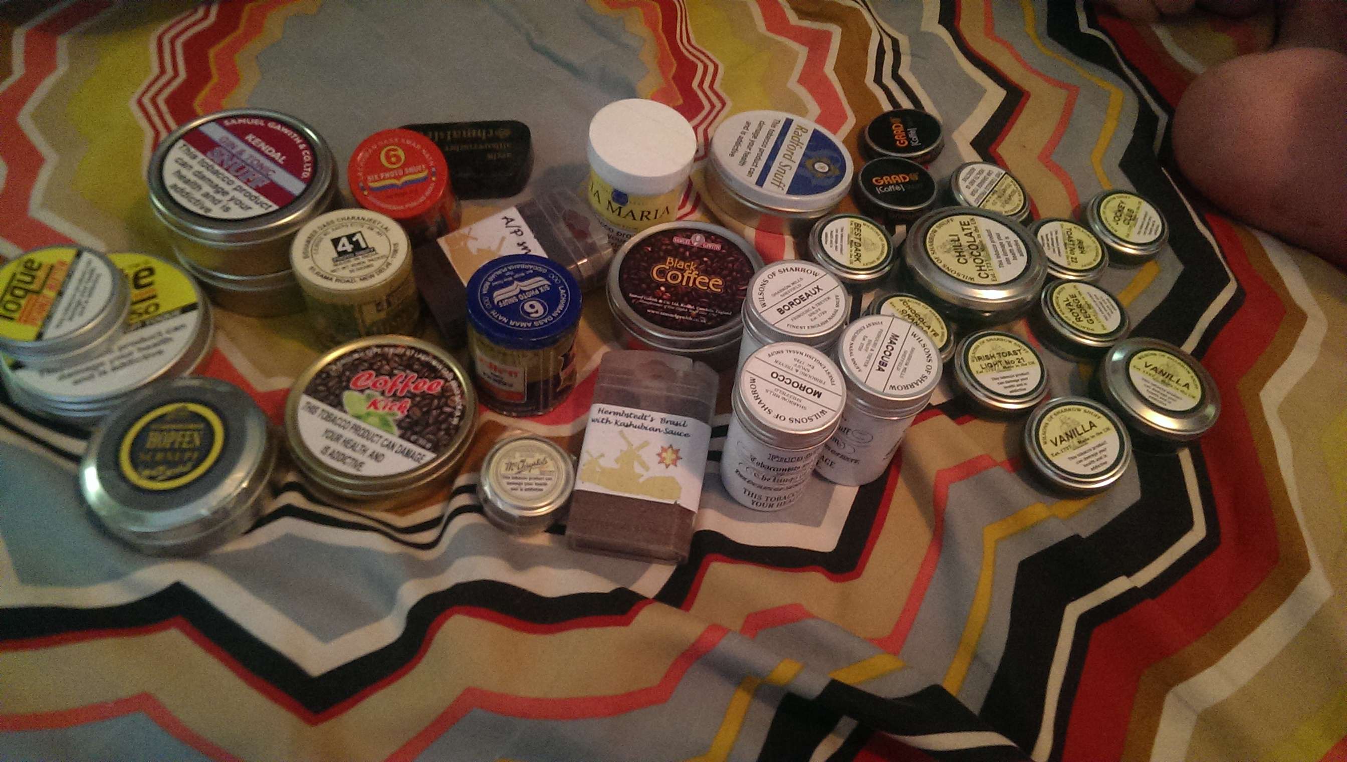New order from Mr. Snuff and boy am I thrilled!!! Viking Peach Paul Gotard Apricot Swedish Match Txi Blue Wilsons - Gold Label, Carnation, Lemon Lime, natural, Bubblegum, Clove Stok - Peach, Orange 6 Photo - Kailash, Natural, Special Gawith Hoggarth Wallflower Samueal Gawith - Wild Duck, Black Coffee, Celtic Talisman Bernard - Pariser, Gekachelter Virgie, Feinster Kownoer Dean Swift Apricot de Kralingse - Bon Bon, Gingerbread, A/P, Mettaijer, Pompadour, Prins Regent, Holandse Bolongaro, Musino Tabak YAHOO!!! Have another in the mail for next week. Waiting is so very hard to do…